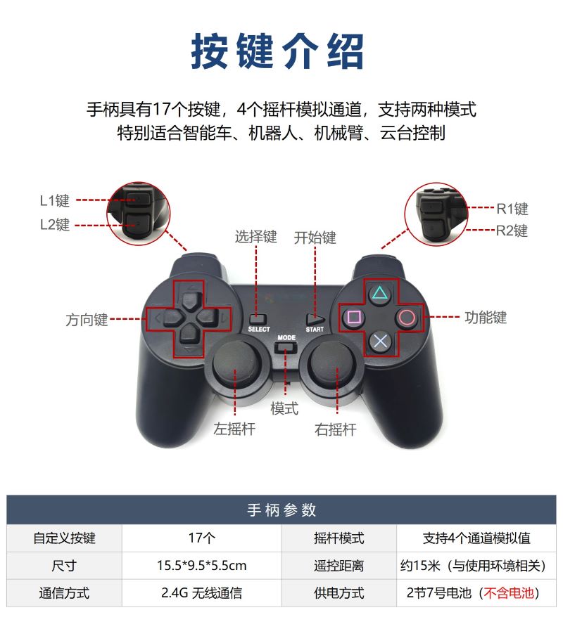 產品簡介:2.4G PS2無線手柄具有17個按鍵,4個搖桿模擬通道,支持兩種模式,無配對情況下,自動休眠,遙控距離可達15米,提供原創產品資料,STM32開發代碼等,特別適合智能車、機器人、機械臂、云臺等控制。