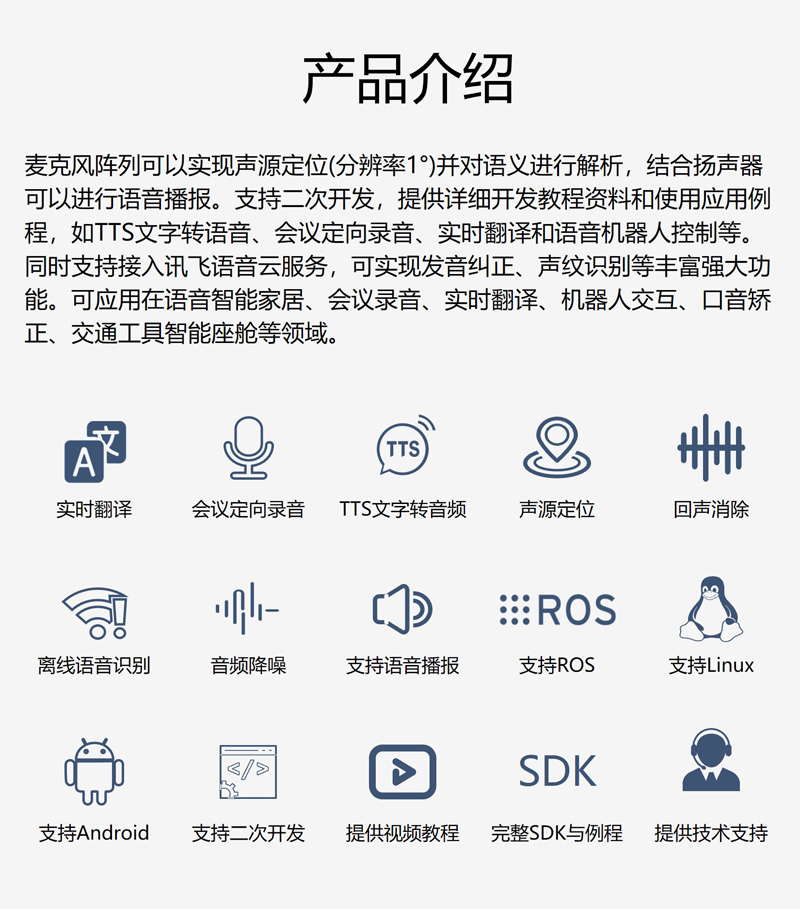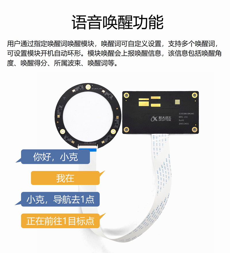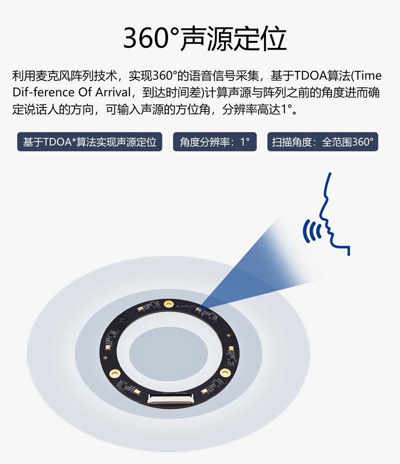 產品簡介:麥克風陣列可以實現聲源定位(分辨率1)并對語義進行解析,結合揚聲器可以進行語音播報。支持二次開發,提供詳細開發教程資料和使用應用例程,如TTS文字轉語音、會議定向錄音、實時翻譯和語音機器人控制等。同時支持接入訊飛語音云服務,可實現發音糾正、聲紋識別等豐富強大功能??蓱迷谡Z音智能家居、會議錄音、實時翻譯、機器人交互、口音矯正、交通工具智能座艙等領域。