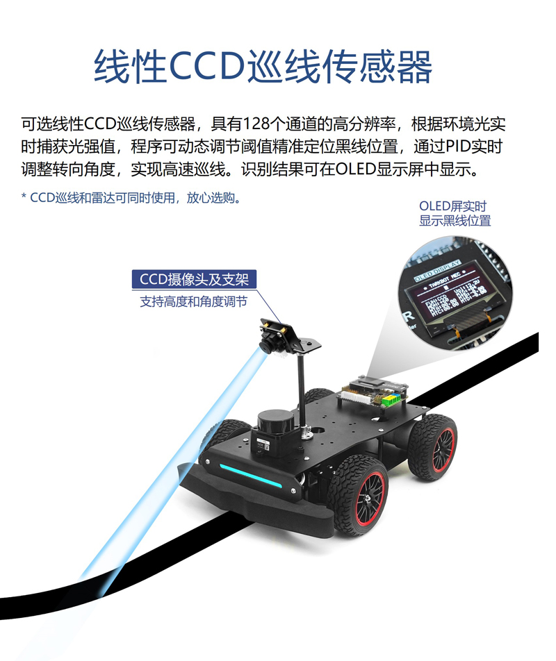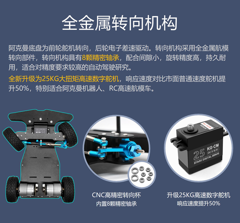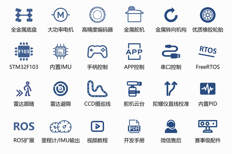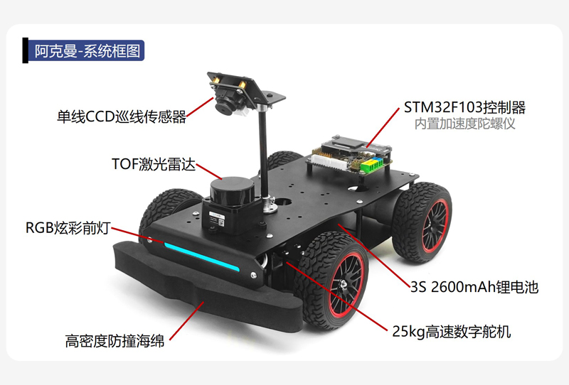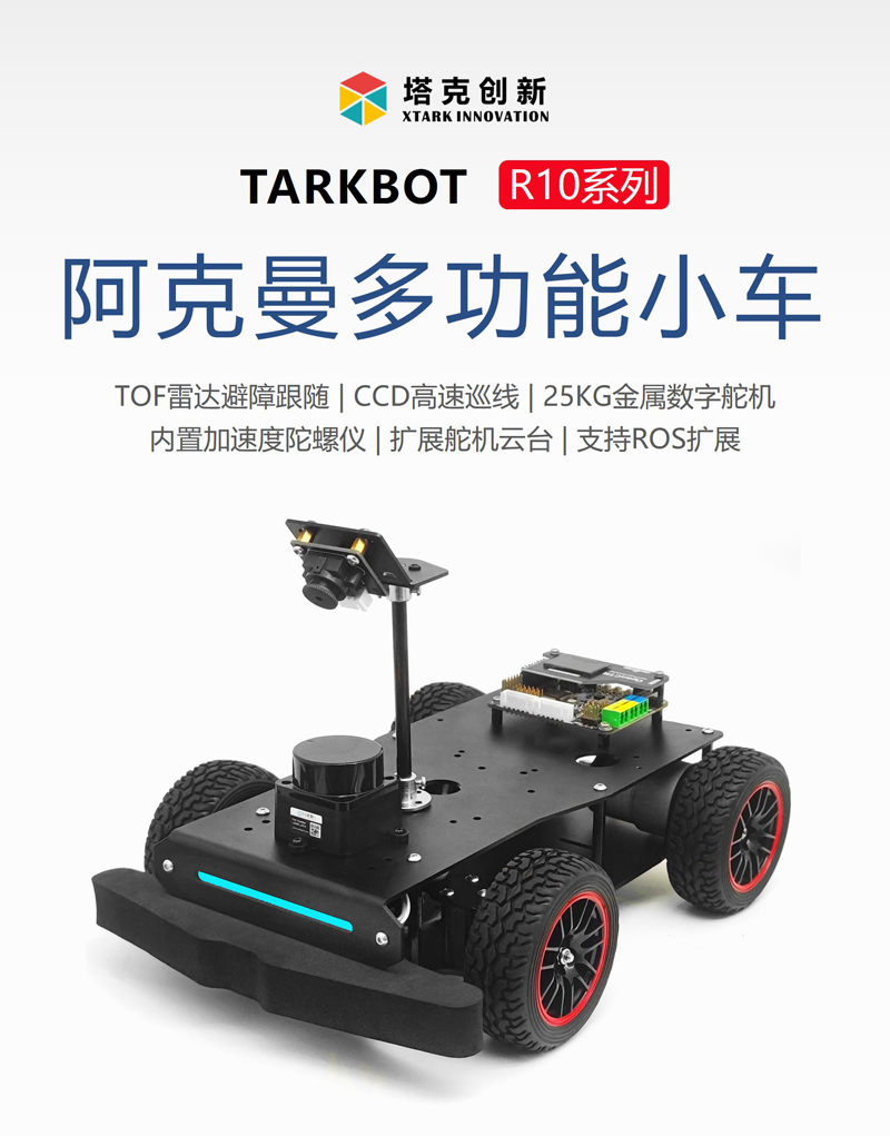 產品簡介:TARKBOT R10系列阿克曼舵機轉向小車是塔克創新面向大學生電子設計競賽/DIY小車/學科實訓教學場景開發的多功能智能小車。搭載520大功率高精度霍爾編碼器減速電機,25KG金屬高速數字舵機,全金屬底盤,負載可達3kg,適合各類小車賽事。主控采用STM32F103RCT6,支持2路編碼器電機PID速度閉環控制,6路PWM舵機,內置IMU加速度陀螺儀,支持PS2手柄、藍牙APP、航模遙控器控制,可選CCD巡線模塊、TOF雷達避障跟隨、舵機云臺等豐富配件。支持ROS擴展,可通過USB串口、TTL串口控制,內置開源運動學解算,可輸出里程計、IMU、電量等信息。使用自己的樹莓派、旭日X3等主控可快速制作ROS機器人。提供視頻教程和源碼,支持二次開發。
