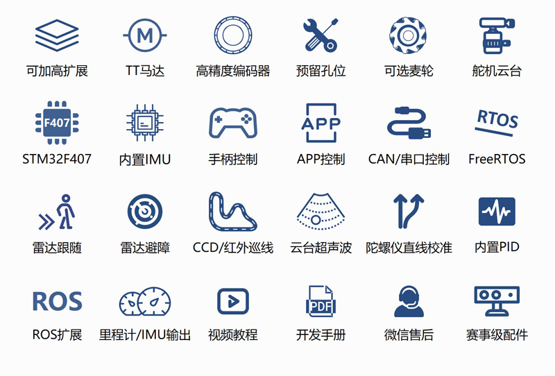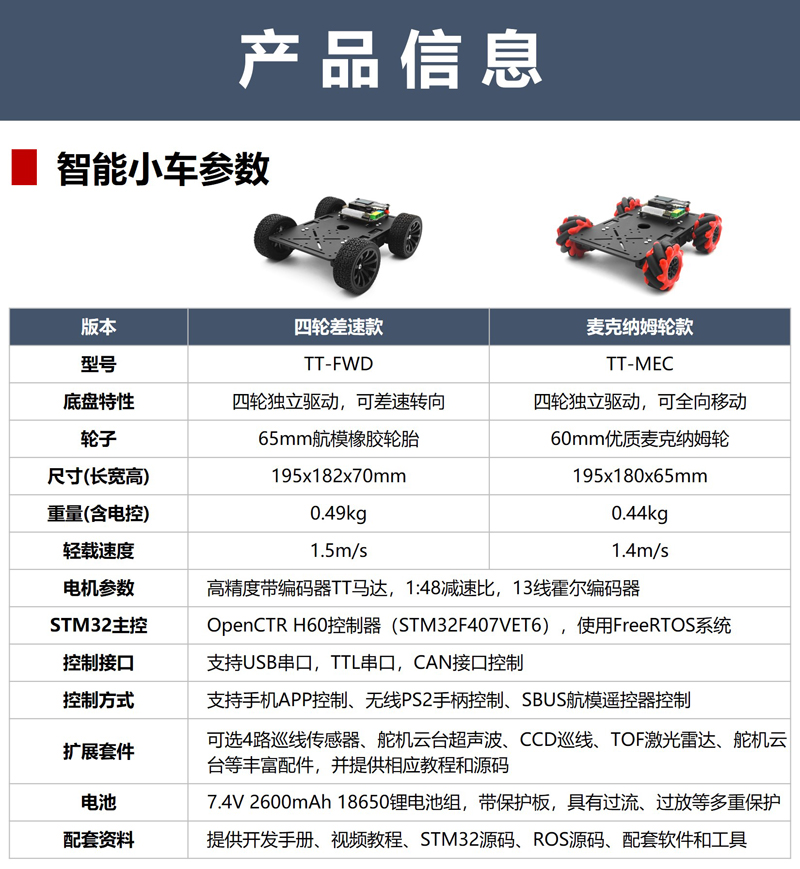 產(chǎn)品簡(jiǎn)介:TARKBOT TT馬達(dá)系列小車是塔克創(chuàng)新面向大學(xué)生電子設(shè)計(jì)競(jìng)賽/DIY小車/學(xué)科實(shí)訓(xùn)教學(xué)場(chǎng)景開發(fā)的多功能智能小車。搭載帶編碼器金屬軸TT馬達(dá),外觀小巧精致,適合各類小車賽事。主控采用STM32F407VET6,支持4路編碼器電機(jī)PID速度閉環(huán)控制,6路PWM舵機(jī),內(nèi)置IMU加速度陀螺儀。支持PS2手柄、手機(jī)藍(lán)牙APP、航模遙控器控制,可選4路紅外巡線模塊、CCD巡線模塊、云臺(tái)超聲波避障、TOF雷達(dá)避障跟隨、舵機(jī)云臺(tái)等豐富配件。支持ROS擴(kuò)展,可通過USB串口、TTL串口、CAN接口控制,內(nèi)置開源運(yùn)動(dòng)學(xué)解算,可輸出里程計(jì)、IMU、電量等信息。使用自己的樹莓派等主控可快速制作ROS機(jī)器人。提供視頻教程和源碼,支持二次開發(fā)。