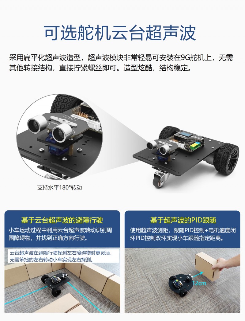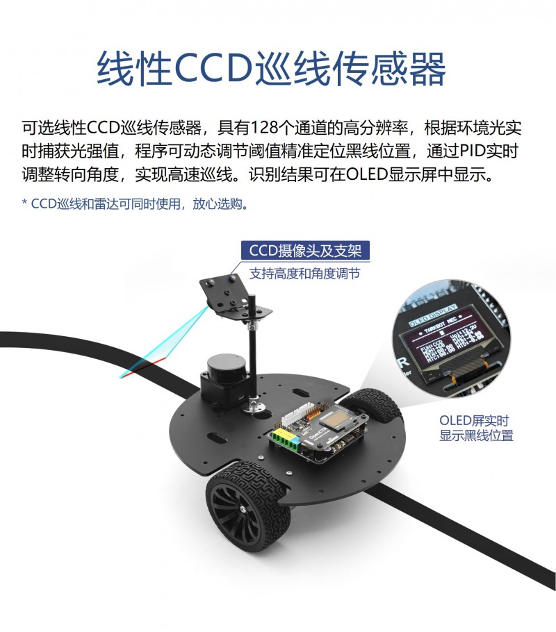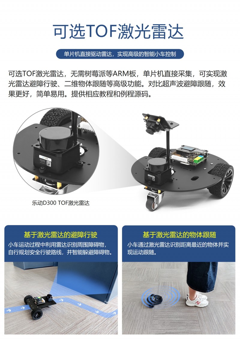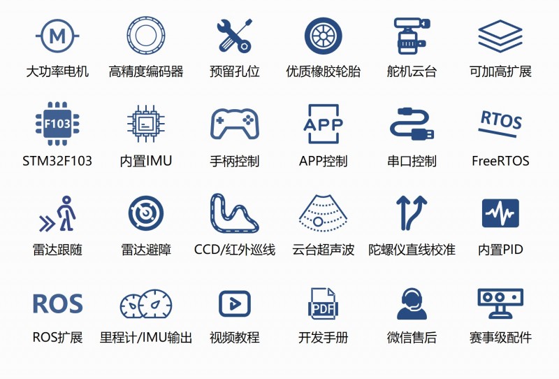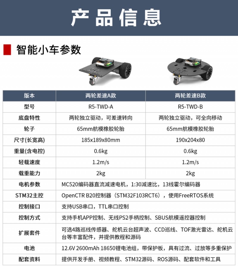 產(chǎn)品簡(jiǎn)介: TARKBOT R5系列兩輪小車是塔克創(chuàng)新面向大學(xué)生電子設(shè)計(jì)競(jìng)賽/DIY小車/學(xué)科實(shí)訓(xùn)教學(xué)場(chǎng)景開發(fā)的多功能智能小車。主控采用STM32F103RCT6,內(nèi)置IMU加速度陀螺儀傳感器,搭載520大功率霍爾編碼器電機(jī)。小車支持PS2手柄、手機(jī)藍(lán)牙APP、航模遙控器控制,可選四路紅外巡線模塊、CCD巡線模塊、云臺(tái)超聲波避障、TOF雷達(dá)避障跟隨、舵機(jī)云臺(tái)等豐富配件。支持ROS擴(kuò)展,可通過USB串口、TTL串口控制,提供視頻教程和源碼,支持二次開發(fā),特別適合各類小車賽事。