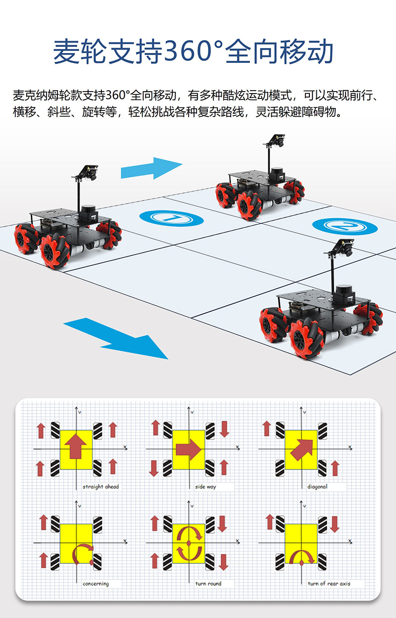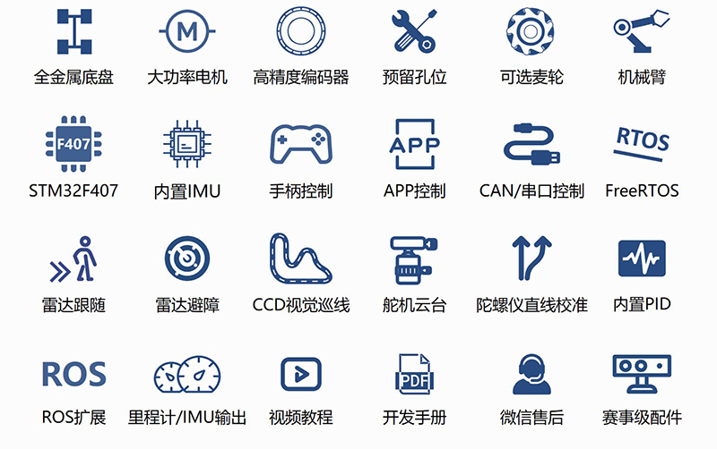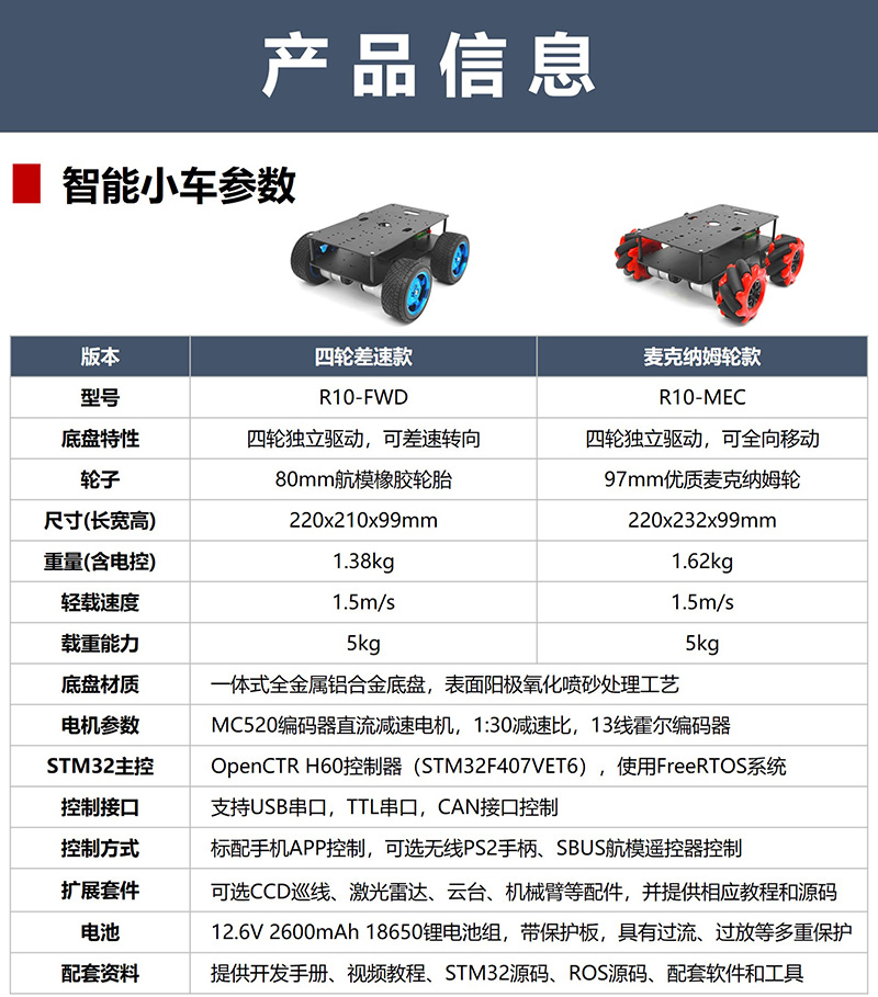 產(chǎn)品簡介:TARKBOT R10系列四輪/麥輪小車是塔克創(chuàng)新面向大學(xué)生電子設(shè)計(jì)競賽/DIY小車/學(xué)科實(shí)訓(xùn)教學(xué)場景開發(fā)的多功能智能小車。搭載520大功率高精度霍爾編碼器減速電機(jī),全金屬底盤,負(fù)載可達(dá)5kg,適合各類小車賽事。 主控采用STM32F407VET6,支持4路編碼器電機(jī)PID速度閉環(huán)控制,6路PWM舵機(jī),內(nèi)置IMU加速度陀螺儀。小車支持PS2手柄、手機(jī)藍(lán)牙APP、航模遙控器控制,可選CCD巡線模塊、TOF雷達(dá)避障跟隨、舵機(jī)云臺、機(jī)械臂等豐富配件。支持ROS擴(kuò)展,可通過USB串口、TTL串口、CAN接口控制,內(nèi)置開源運(yùn)動學(xué)解算,可輸出里程計(jì)、IMU、電量等信息。使用自己的樹莓派、Nano等主控可快速制作ROS機(jī)器人。提供視頻教程和源碼,支持二次開發(fā)。