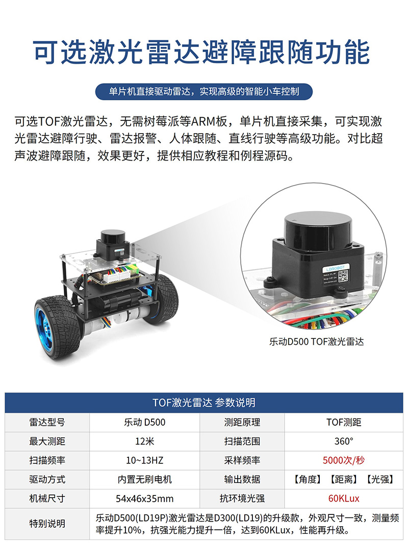 產品簡介:TARKBOT B690系列平衡小車采用一體化金屬底盤設計,520大功率編碼器電機,負載可達3KG。采用驅控一體式控制器OpenCTR H60(STM32F407VET6) ,小巧緊湊,內置IMU加速度陀螺儀傳感器,具有酷炫RGB編程彩燈。小車支持PS2無線手柄、藍牙APP控制、航模遙控器控制,支持CAN總線控制,支持STM32直接連接激光雷達實現避障跟隨功能,支持CCD高速巡線功能,可擴展舵機云臺。提供專業串口波形調試軟件,方便PID調試。小車支持通過USB串口進行ROS擴展。使用自己的樹莓派等主控可快速制作ROS自平衡機器人。提供ROS驅動包源碼、開發手冊和視頻教程,方便二次開發。