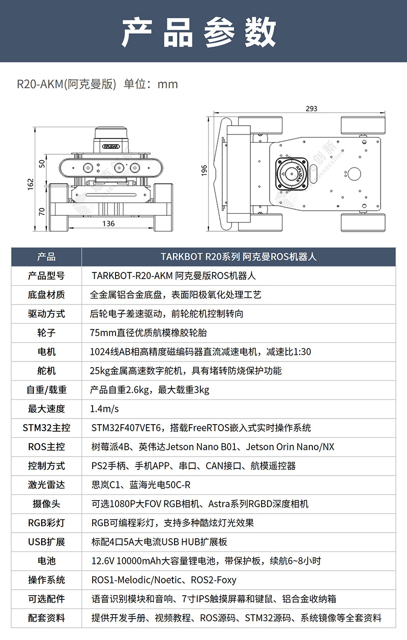 產(chǎn)品簡介:塔克創(chuàng)新TARKBOT R20系列是針對ROS教育科研的旗艦產(chǎn)品,支持主流的樹莓派4B、英偉達(dá)Jetson Nano、Orion Nano/NX系列主控,支持ROS1和ROS2系統(tǒng)。具有1024線高精度編碼器,STM32F407主控,酷炫可編程RGB彩燈,搭載奧比中光深度相機(jī)、激光雷達(dá)、語音交互配件。可實現(xiàn)機(jī)器人運(yùn)動控制、SLAM建圖導(dǎo)航、機(jī)器視覺、3D視覺、語音控制、跟隨避障、多機(jī)器人編隊等功能,提供800+頁手冊和200+源碼級中英字幕視頻教程,提供技術(shù)支持,可零基礎(chǔ)入門和進(jìn)階學(xué)習(xí)。
