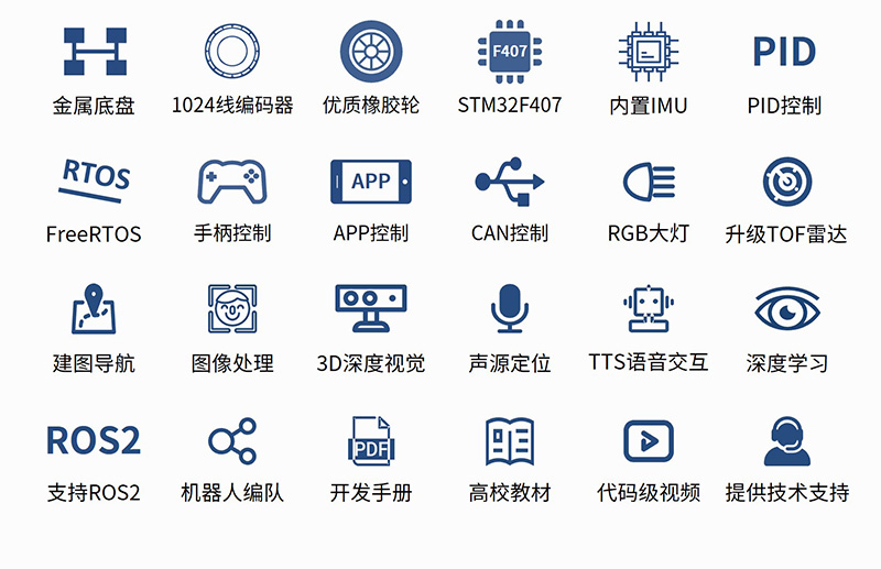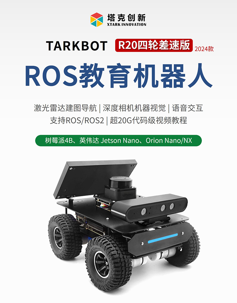 產(chǎn)品簡介:塔克創(chuàng)新TARKBOT R20系列是針對ROS教育科研的旗艦產(chǎn)品,支持主流的樹莓派4B、英偉達Jetson Nano、Orion Nano/NX系列主控,支持ROS1和ROS2系統(tǒng)。具有1024線高精度編碼器,STM32F407主控,酷炫可編程RGB彩燈,搭載奧比中光深度相機、激光雷達、語音交互配件。可實現(xiàn)機器人運動控制、SLAM建圖導(dǎo)航、機器視覺、3D視覺、語音控制、跟隨避障、多機器人編隊等功能,提供800+頁手冊和200+源碼級中英字幕視頻教程,提供技術(shù)支持,可零基礎(chǔ)入門和進階學(xué)習(xí)。