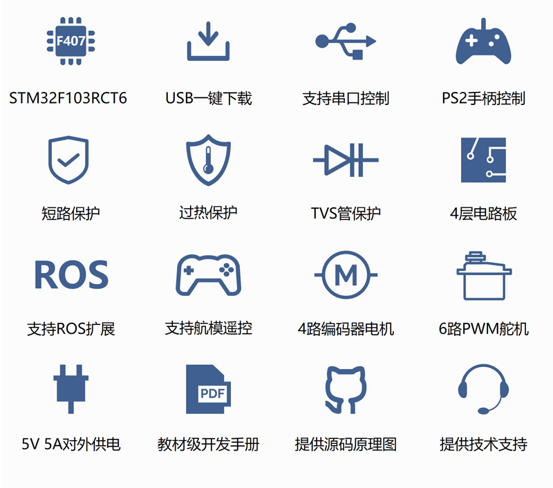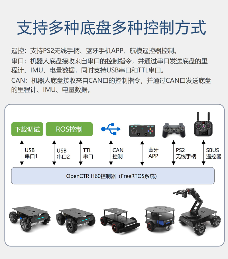 產品簡介:OpenCTR H60是專為ROS機器人和智能車設計的開源控制器,可以控制麥輪、阿克曼、差速、全向輪、履帶、機械臂等多種底盤。控制器支持4路編碼器電機,6路PWM電機,內置IMU,可通過串口或CAN與外界連接,具有兩路5V5A電源和一路12V5A輸出,可為樹莓派、Nano、工控機等多種主控供電。